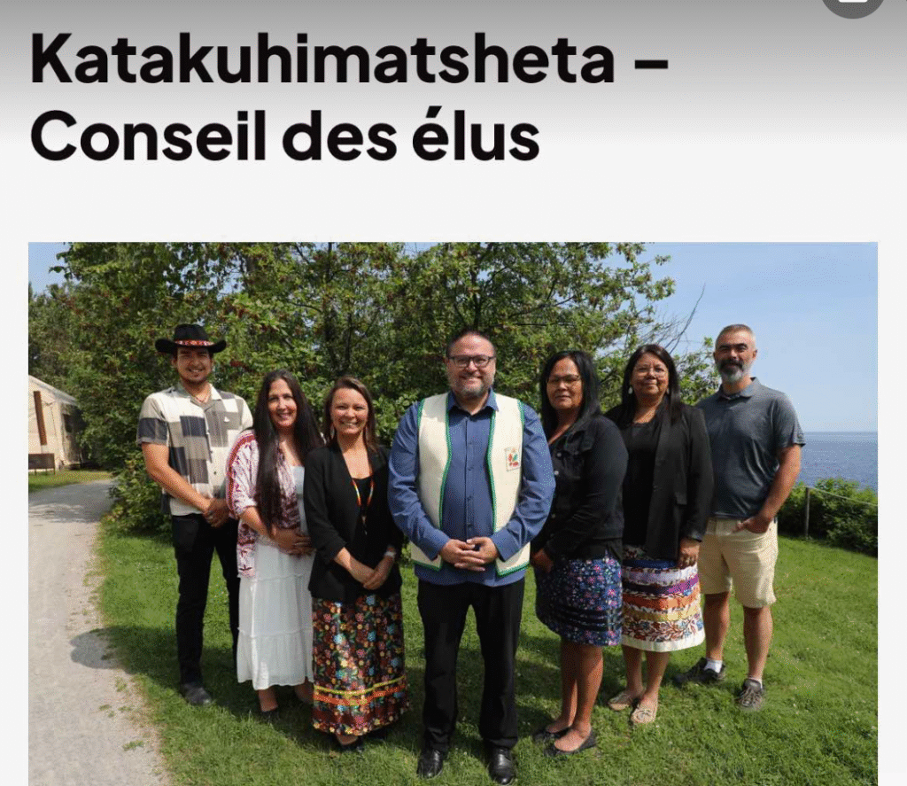 Photo du Conseil des élus de Pekuakamiulnuatsh.Takuhikan, la communauté hôte du RDA 2025, en entrevue, le Chef de Mashteuiash Jonathan Germain, les conseillères Uashat mak Mani-Utenam, Joséphine Pinette, Karine Fontaine et Mélodie Jourdain, Bernard Lafonfaine de Ekuanitshit, Hervé Ottawa de Wemotaci et l’artiste Innu invité pour l’ouverture du RDA, David Hart